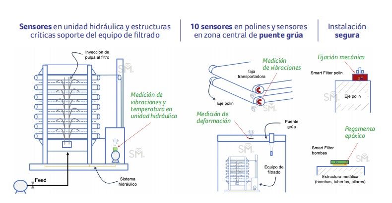 Sensores instalados en componentes críticos de los equipos de filtración permiten el monitoreo en tiempo real de vibración, temperatura, deformación mecánica y sonido, asegurando la disponibilidad, confiabilidad y vida útil de los equipos.