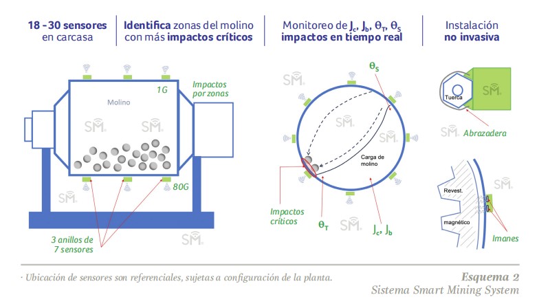 Sensores instalados en las tuercas externas de las carcasas de molinos de bolas y SAG, mediante el registro de impactos que experimenta la carcasa, permiten determinar parámetros de molienda en tiempo real.