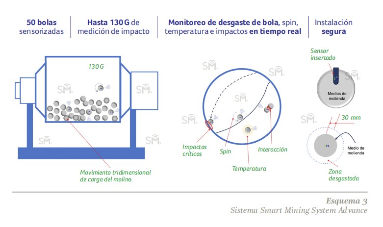 Sensores instalados dentro de un grupo de medios de molienda se introducen al molino en operación para medir el desgaste de las bolas en tiempo real durante el proceso de molienda.